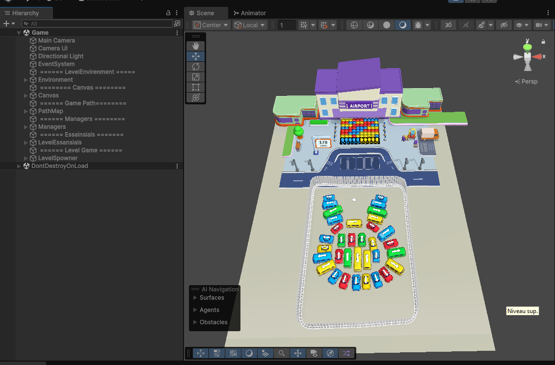 The level is manually placed with the cars, and you can edit every level using the scene called Level Generator. You then save the ScriptableObject to use it in the game scene.